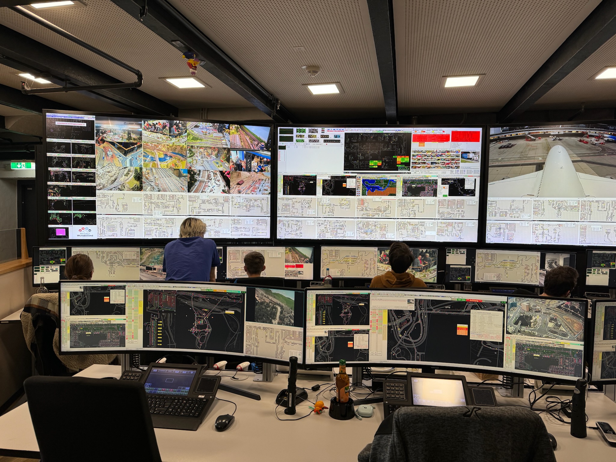 Heute war ich am Leitstand. Vom Leitstand aus kann man die gesamte Anlage überwachen und steuern. Mittlerweile gibt es im Wunderland 2 Leitstände: einen großen in Mitteldeutschland und einen kleinen in Rio. Der kleine Leitstand besteht aus zwei Terminals, zwei Displays und einem großen Fernseher. Der große Leitstand besteht aus acht Terminals mit jeweils einem Bildschirm und insgesamt drei sehr große Fernsehern. Der kleine Leitstand wird eher selten verwendet.