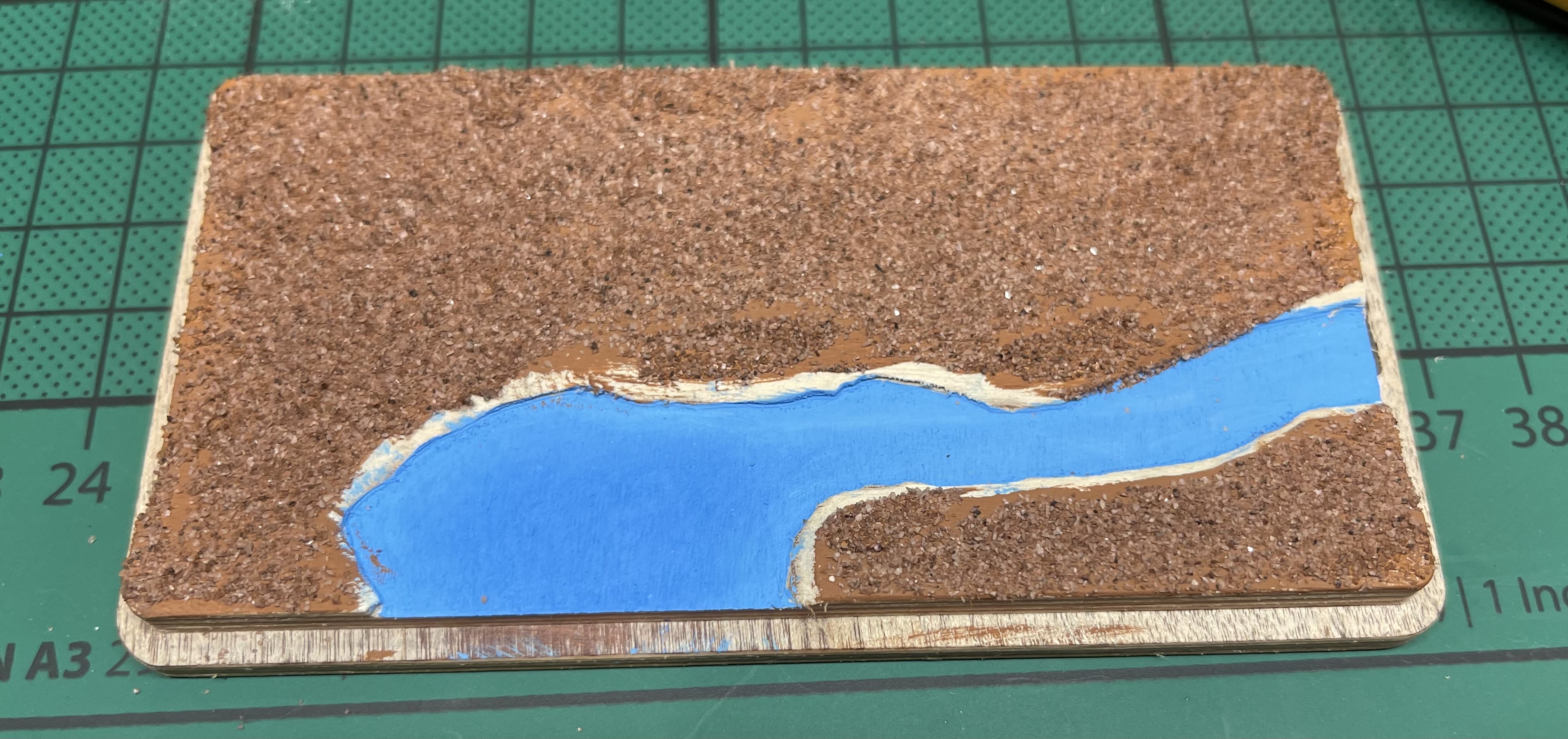 Danach habe ich den Rest der Bodenplatte mit einer dünnen Schicht brauner Farbe bepinselt und mit Sand bestreut.