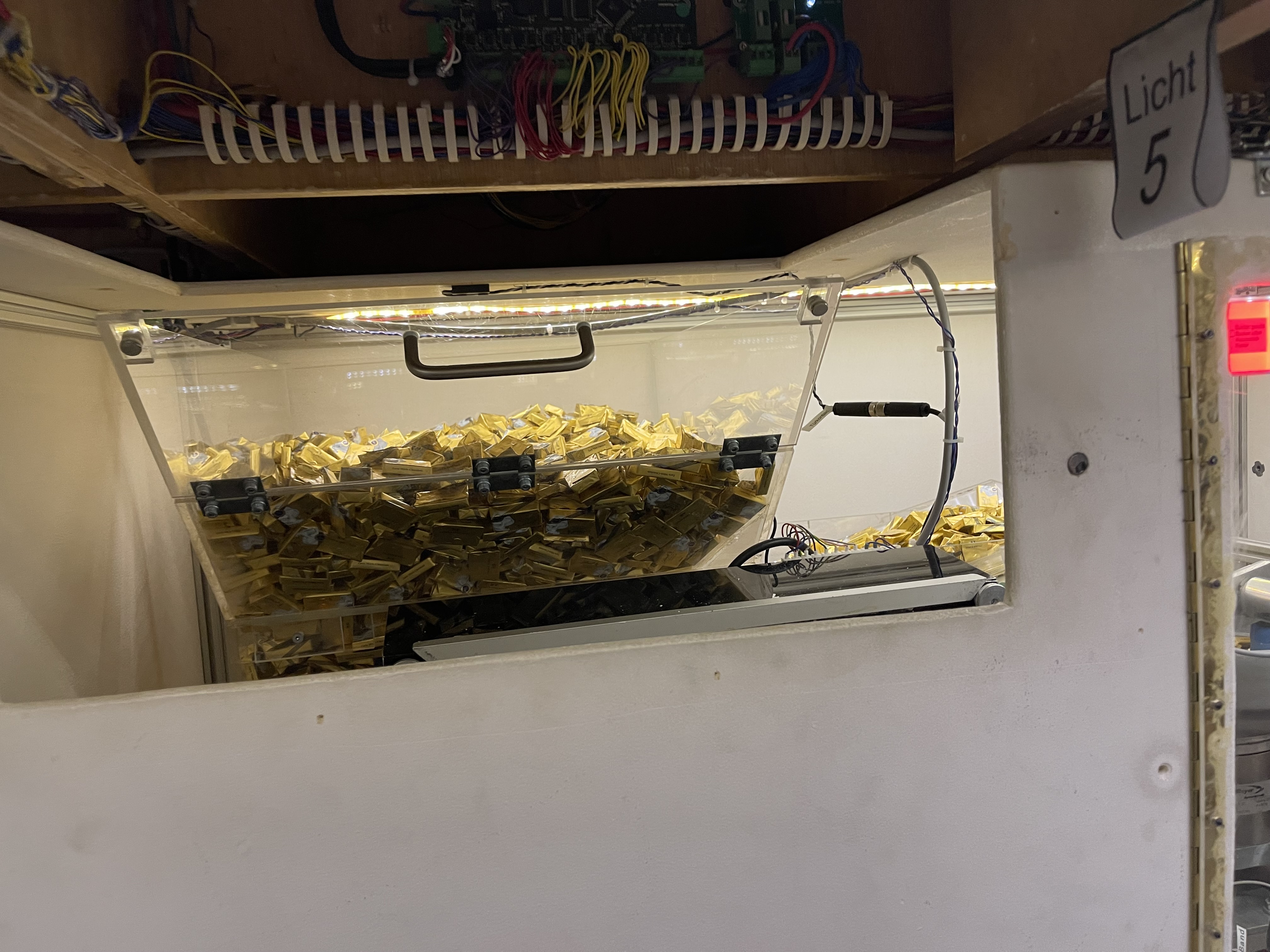 Als wir in der Schweiz waren, haben wir gesehen, dass der Schokoladenbunker der Schokoladenfabrik fast leer war. Also haben wir aus dem Kühlschrank zwei neue Packungen Schokoladentäfelchen geholt, unter der Anlage zum Bunker gebracht und in den Bunker entleert. Zum Schluss haben wir noch ein zweites Täfelchen Schokolade auf das Förderband für die nächste Person (die dann statt nur einer gleich zwei Täfelchen bekäme) gelegt und waren dann unter der Schweiz fürs erste fertig. Der Schokospeicher wird vermutlich für ca. zwei bis drei Tage halten. Die Schokoladentäfelchen werden übrigens von der Firma Lindt bereitgestellt.