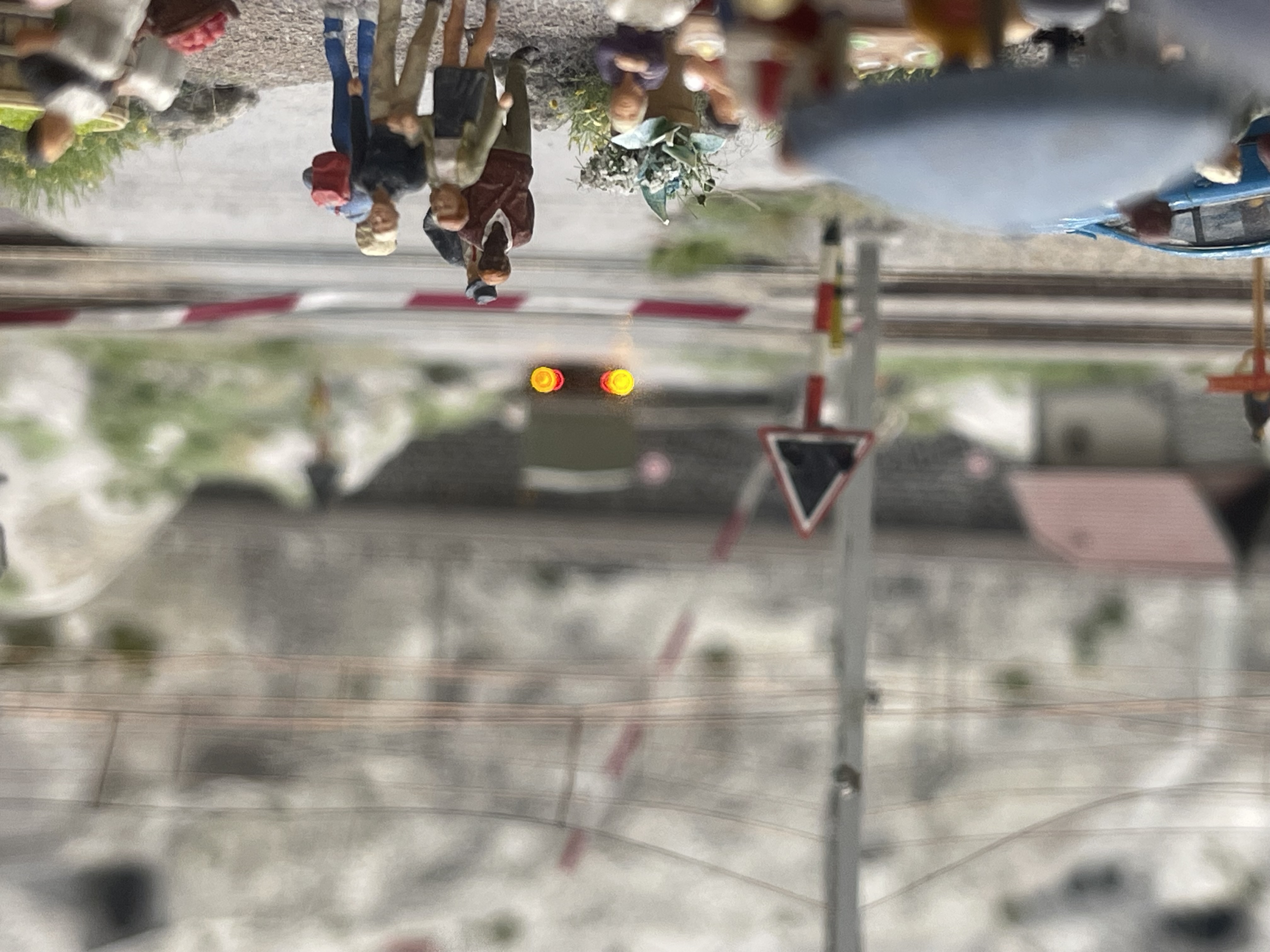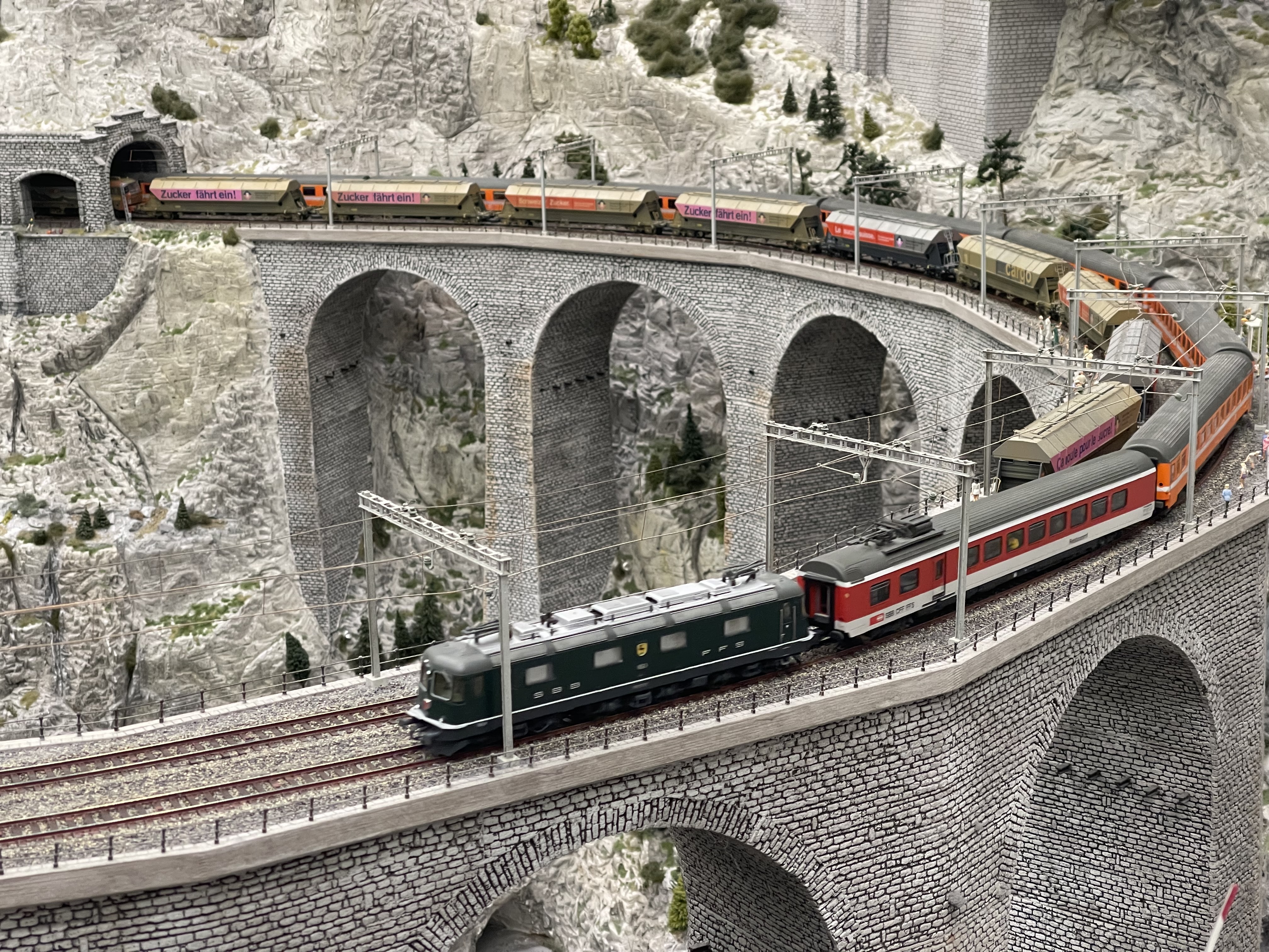 Ich habe im Laufe des Tages viele Züge angeschoben. Die Züge müssen manchmal angeschoben werden, weil sich Dreck so ungünstig unter den Rädern der Züge verfängt, dass sie keinen Strom mehr bekommen und deswegen nicht weiterfahren. Außerdem kann es auch passieren, dass der Zug, obwohl die Motoren drehen, nicht voran kommt. Das kann zum Beispiel dann daran liegen, dass eine Steuerplatine einer Lok sich aufgehängt hat. Solche Fehler können oft behoben werden, indem man einfach die Lok kurz anhebt und dadurch stromlos macht und danach wieder aufgleist.