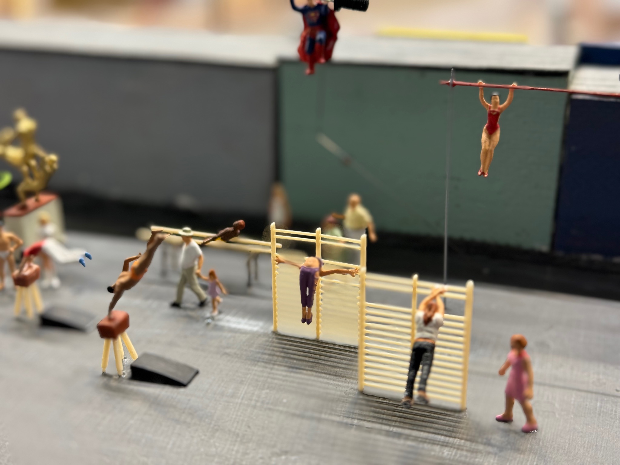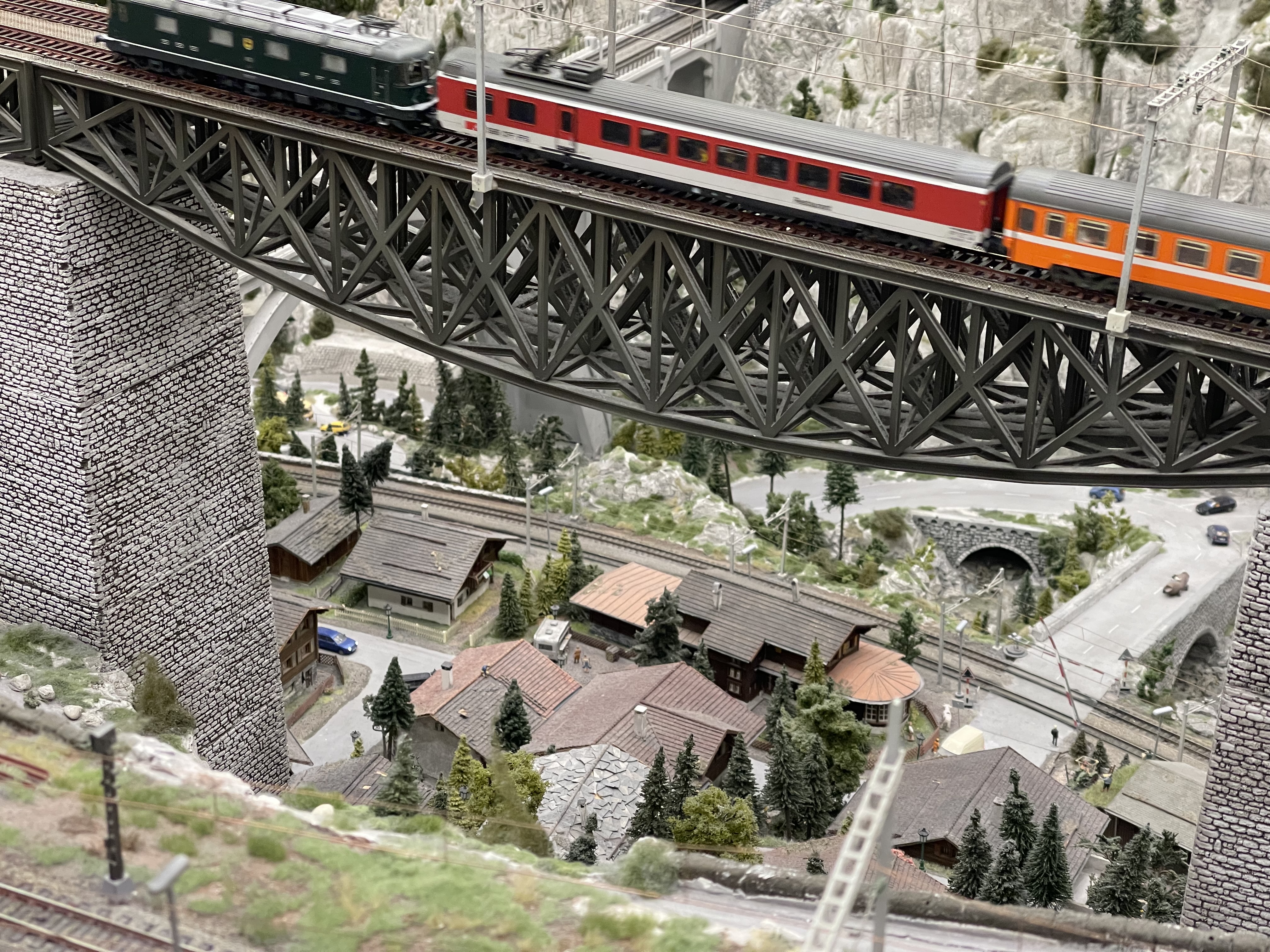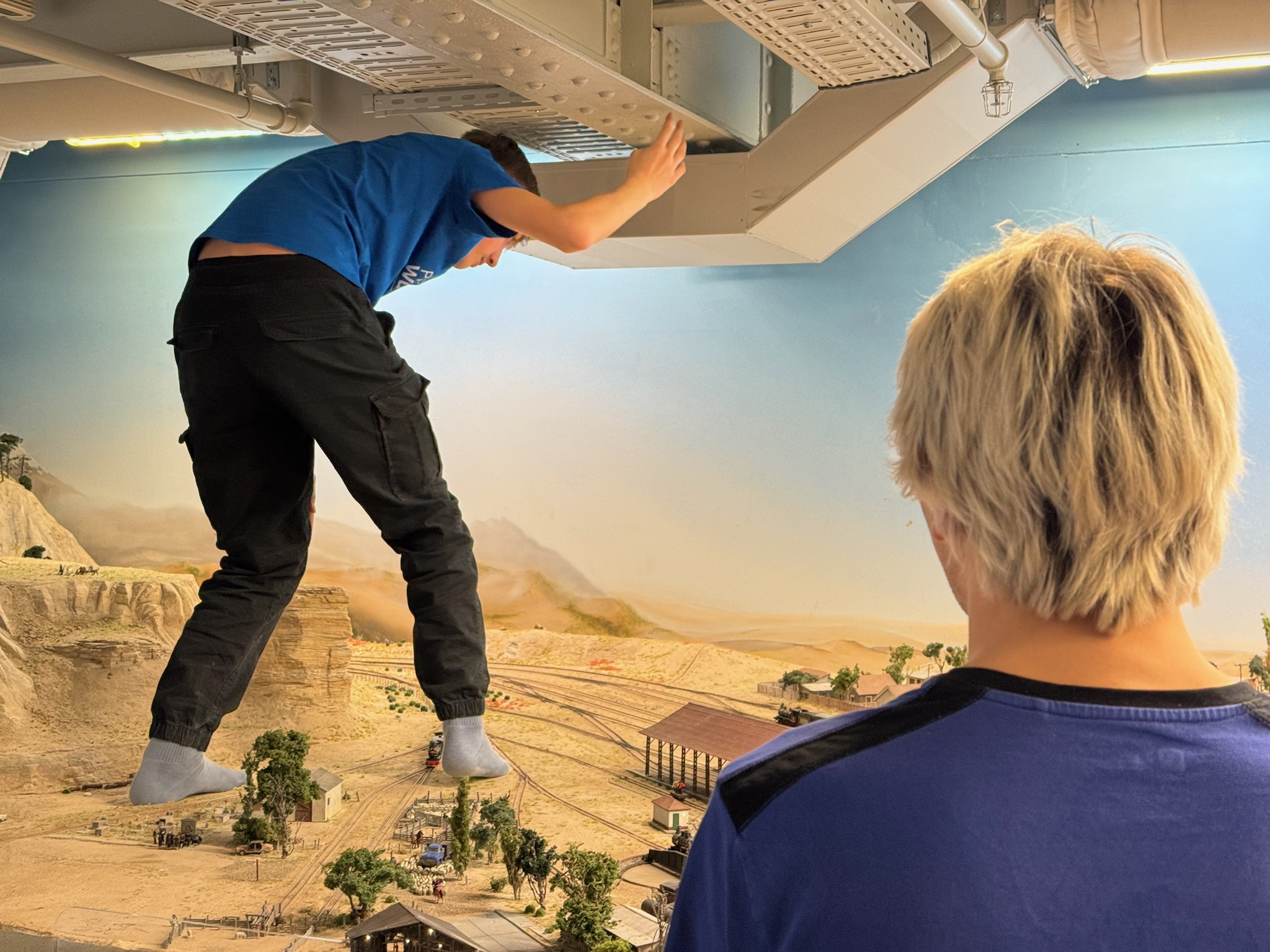 Ich durfte während verschiedener „Missionen“ im Leitstand auch selbst über die Anlage klettern. Wenn man über die Anlage klettert, muss man aufpassen, dass man nur auf nicht bebaute Flächen tritt. Außerdem muss man beachten, dass man erst guckt ob der Ort auf den man sich stellen möchte nachgibt bevor man sich dort mit vollem Gewicht hinstellt. Ich war auch ein paar Mal unter der Anlage. Unter der Anlage gibt es meist Rollbretter mit Kissen darauf, welche benutzt werden, um sich entspannter unter der Anlage zu bewegen. Meist haben die Bretter auch Fächer für z.B. Werkzeug oder Züge. Grundsätzlich ist es unter der Anlage sehr flach, weswegen man aufpassen muss, dass man sich beim umgucken nicht den Kopf stößt. Es gibt aber bei Schattenbahnhöfen oft Bereiche, in denen etwas mehr Luft nach oben ist.