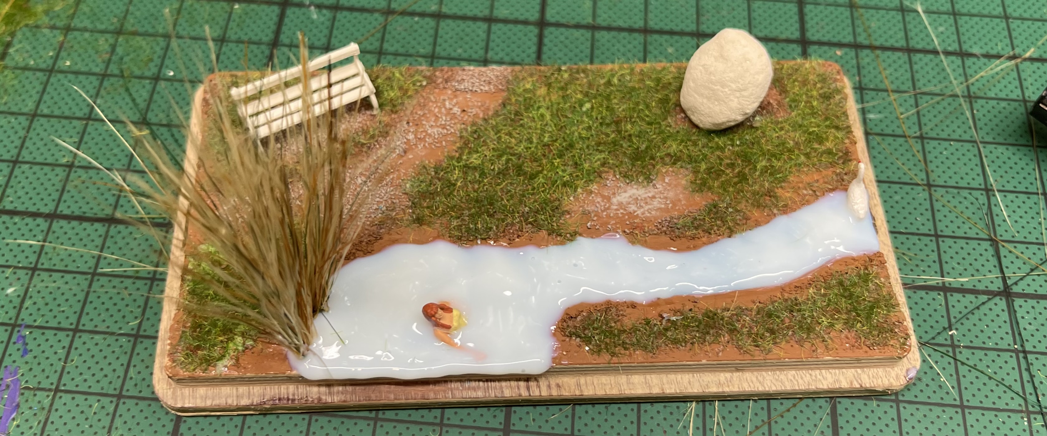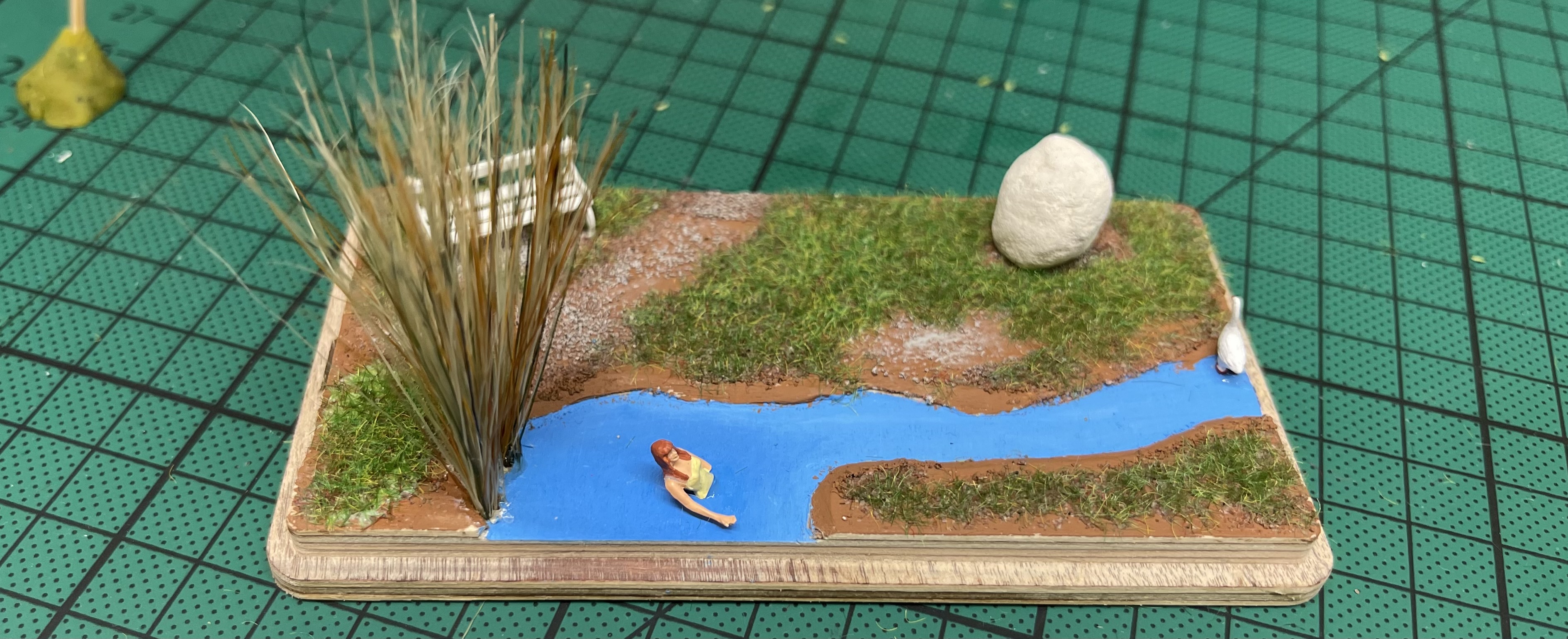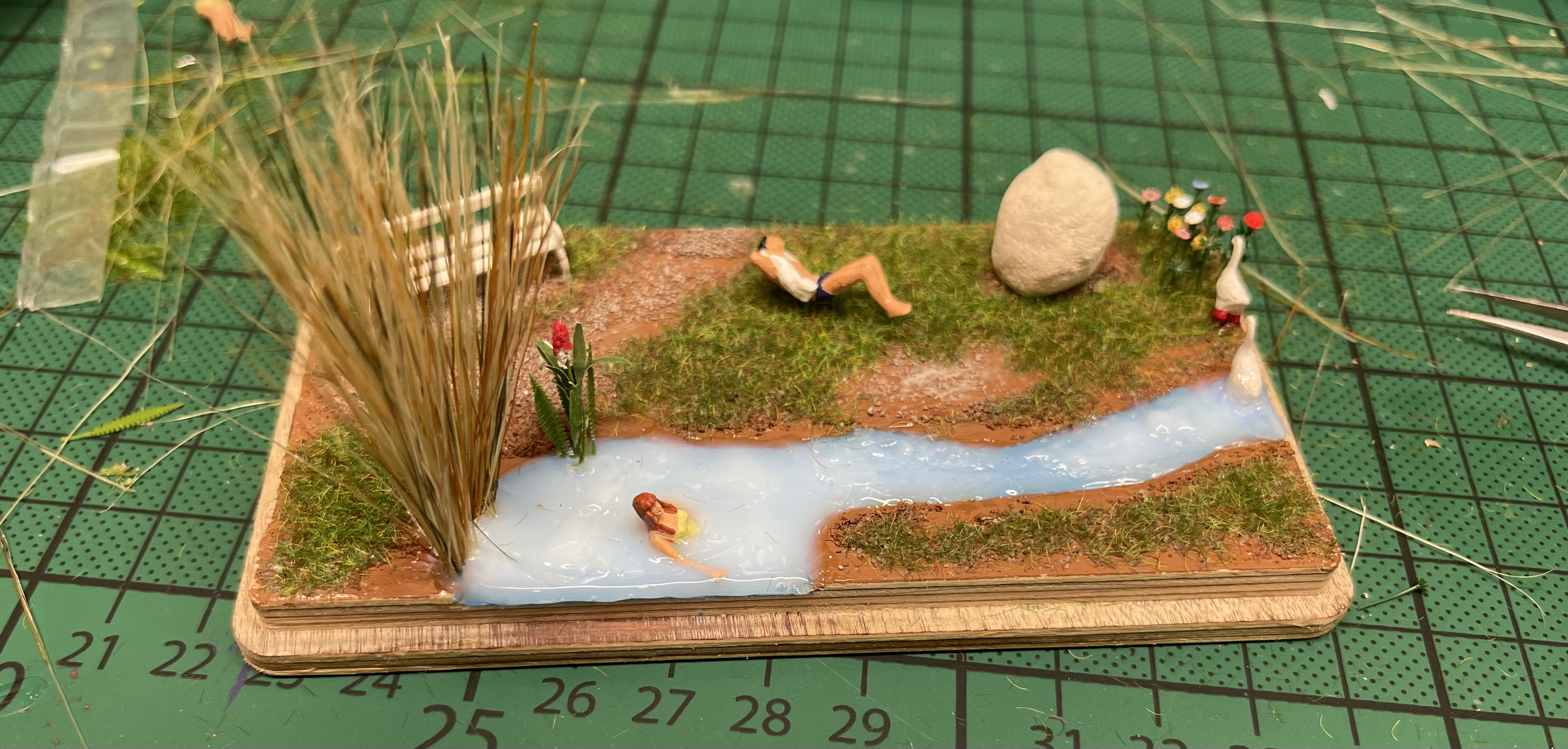 Im nächsten Schritt habe ich die Parkbank und den Stein angeklebt. Außerdem habe ich für das Seegras Löcher gebohrt und das Seegras eingeklebt. Zudem habe ich noch eine schwimmende Frau und eine Gans dort hingeklebt, wo im nächsten Schritt das Wasser platziert wird.