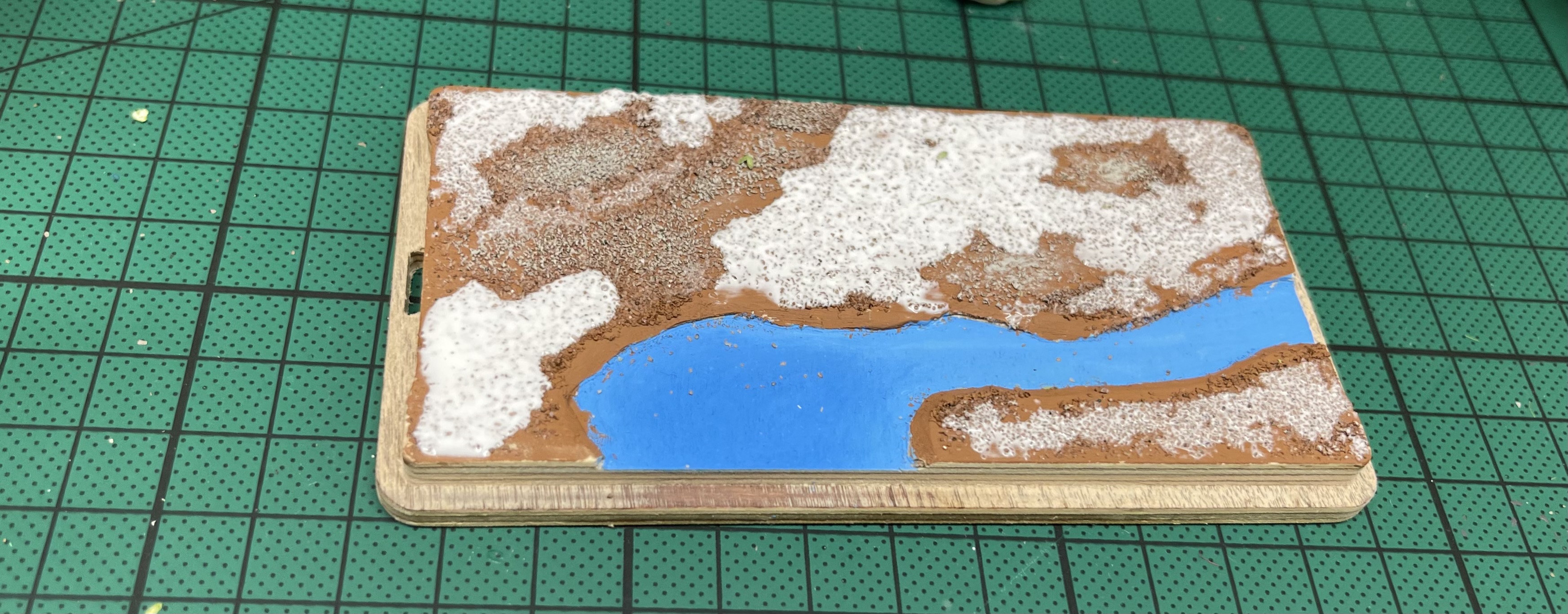 In diesem Schritt habe ich die Wasserfläche gegossen. Hierzu habe ich ein fertiges Mittel von einem Modellbauhersteller verwendet. Dieses Mittel ist am Anfang weiß, wird aber beim Trocknen transparent.