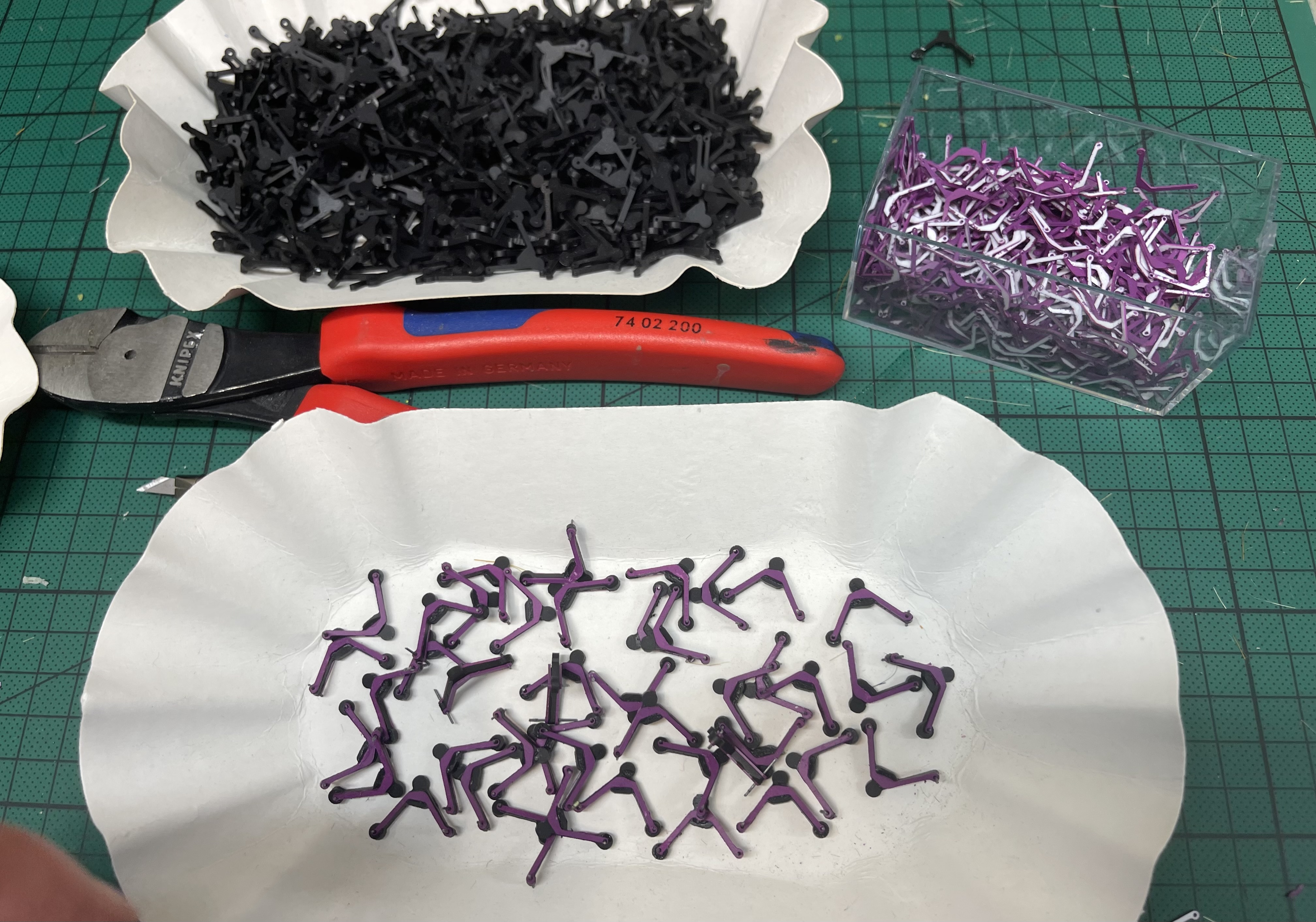 Außerdem habe ich ca. 40 kleine E-Scooter gebastelt. Hierzu musste ich Draht auf die richtigen Längen zurechtschneiden, die Seitenteile auseinander sortieren, ein Hauptteil zurecht legen und alles mit Sekundenkleber zusammenkleben.