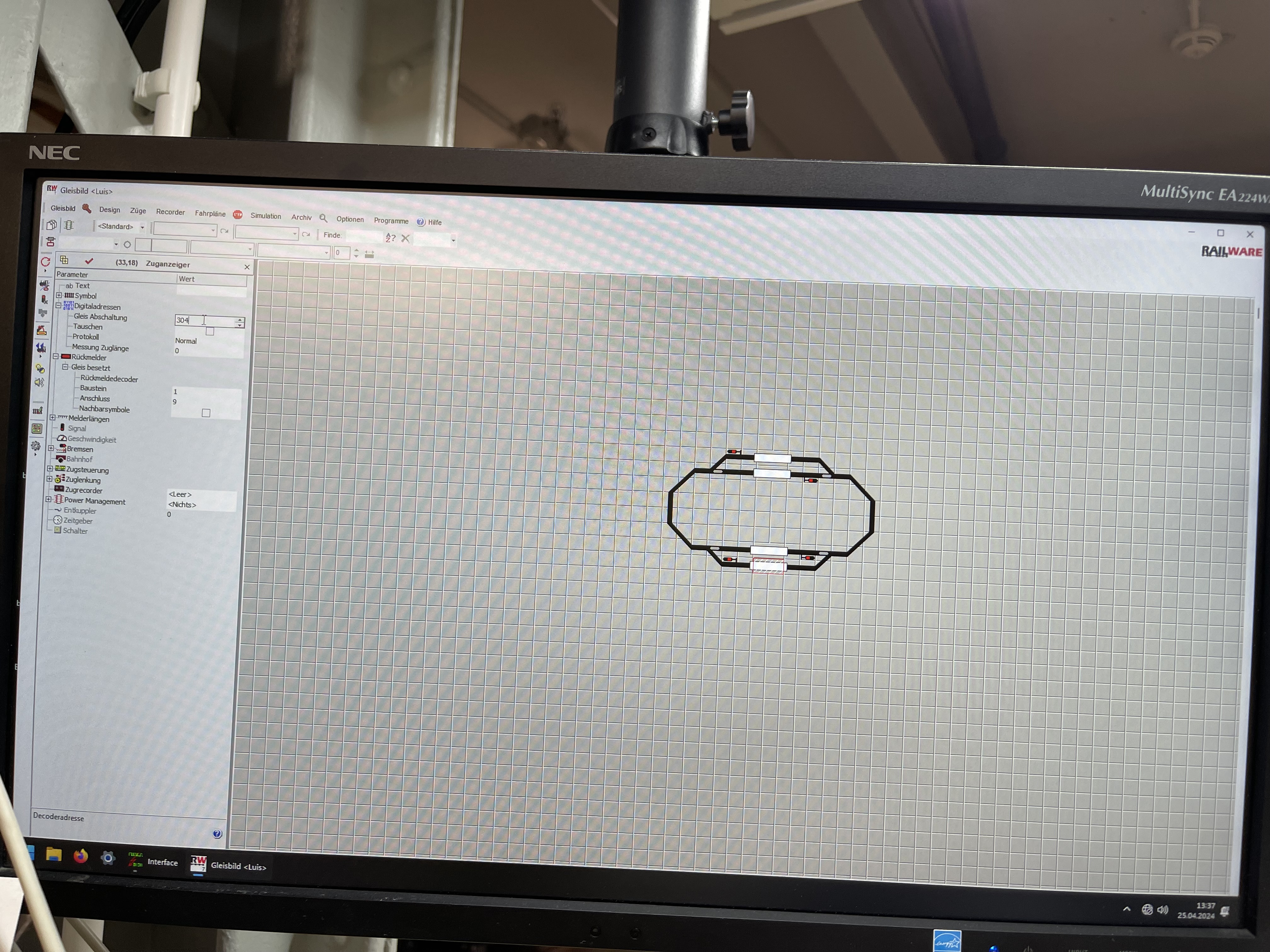 Dann habe ich die Teststrecke in Railware, das Programm, welches das Wunderland nutzt, um alle ihre Züge zu steuern, nachgezeichnet und die Elemente der Strecke mit passenden Adressen versorgt, sodass der Computer einen Zug um die Teststrecke herum fahren kann.