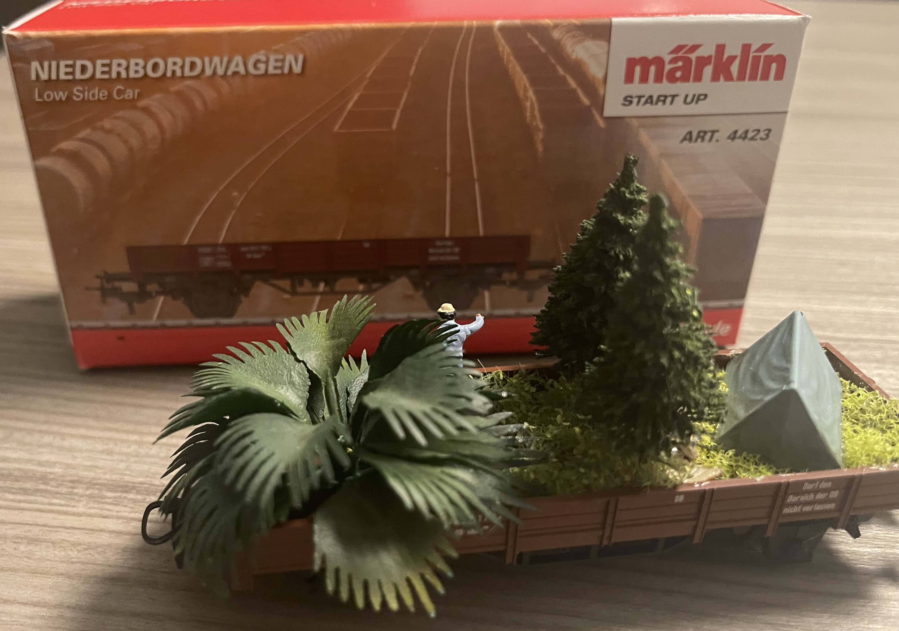 Als Nächstes habe ich einen Waggon dekoriert. Hierzu habe ich mir die Modellnummer des leeren Wagons aus dem internet gesucht. Danach habe ich die Artikelnummer in der Vorratstabelle des Wunderlands gesucht und die Fachnummer notiert. Mit der Notiz sind wir in das Lager gegangen und haben nach dem Fach mit der richtigen Nummer gesucht. Im Fach habe ich dann nach dem richtigen Waggon gesucht und den Waggon haben wir wieder in die Werkstatt genommen. In der Werkstatt angekommen haben wir erst noch die Modellbaukiste der Zugwartung aufgefüllt. Dann habe ich mit Material, welches ich in der Kiste gefunden habe, den Waggon ausgeschmückt. Der Waggon war ursprünglich ein flacher Frachtwagen von Märklin.